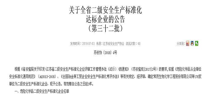 2017年12月,我司申报了江苏省危险化学品二级安全生产标准化企业,经过评审专家的现场检查与审核,公司于2018年7月顺利通过了,获得了江苏省危险化学品二级安全生产标准化企业称号。