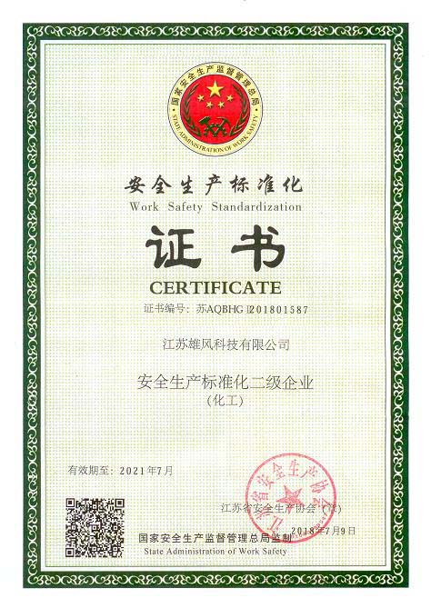雄风科技升级为江苏省危险化学品二级安全生产标准化企业 |